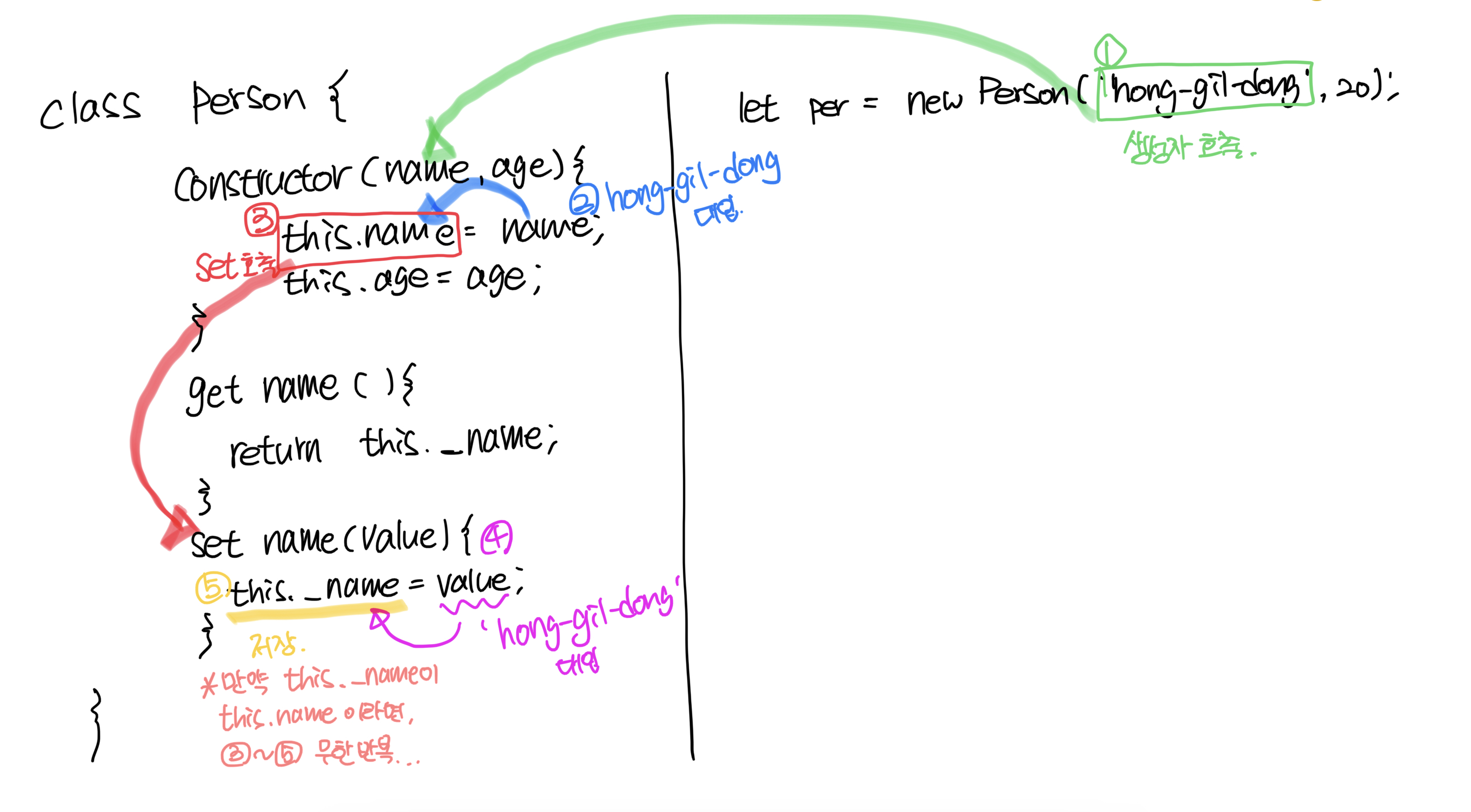 그래서 만일 set 내부에 this.name = value로 작성 하게되면