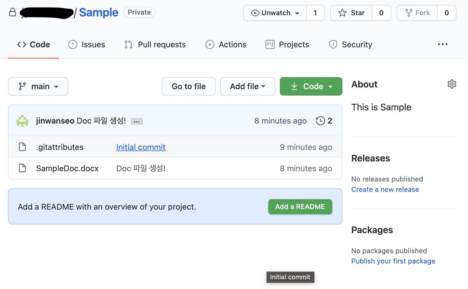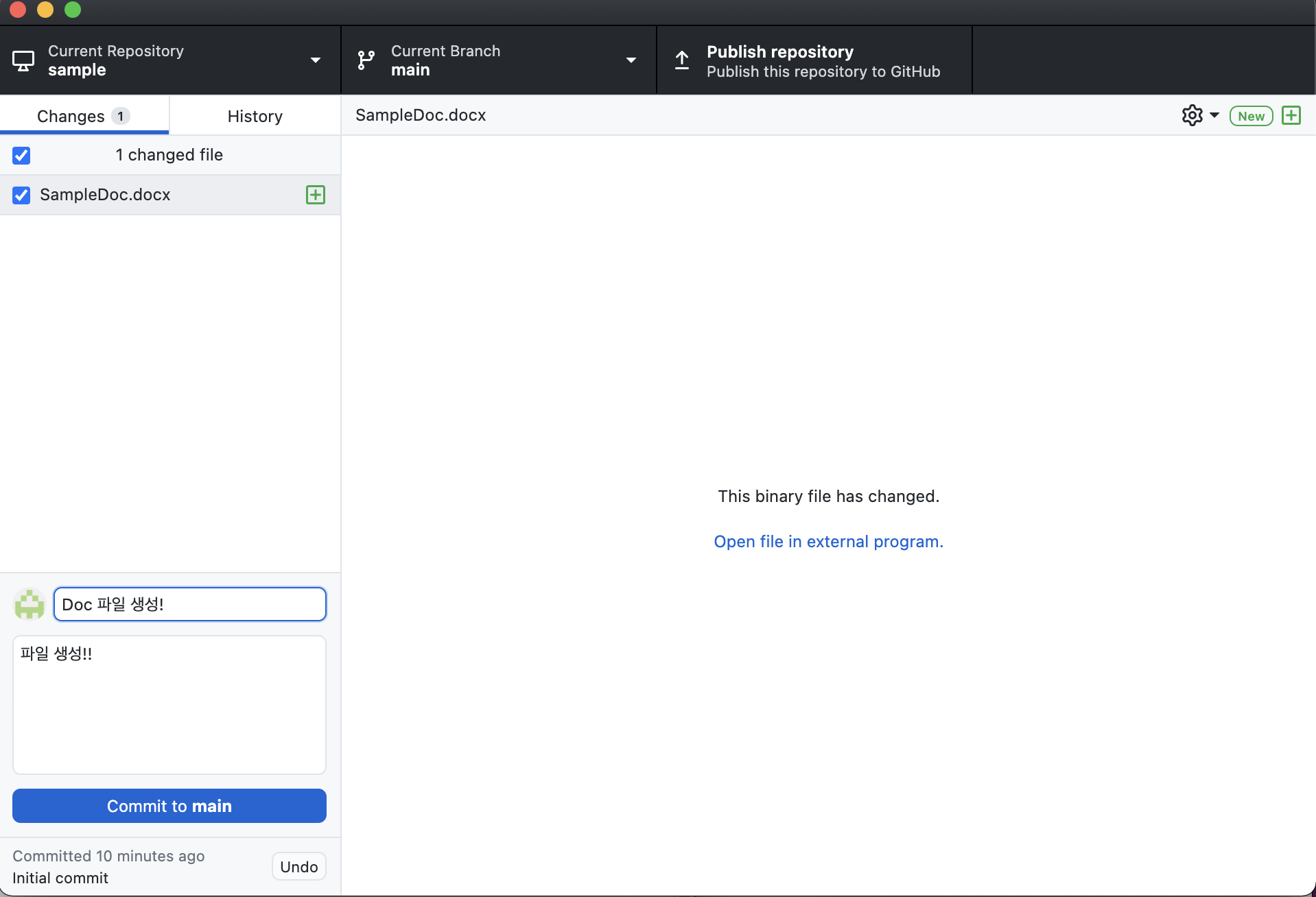 깃이 SampleDoc.docx 를 생성한 것을 알고