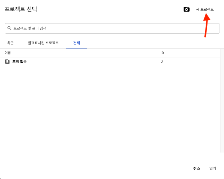 로그인 후 구글 클라우드 플랫폼 페이지 내 왼쪽 위 [프로젝트 선택] 드롭 다운 클릭