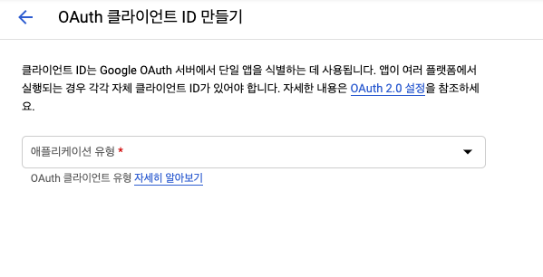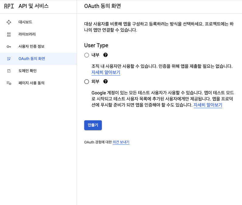 프로젝트 만들기 완료 후 OAuth 동의 화면 클릭 + 아무것도 선택하지 말고 만들기 클릭