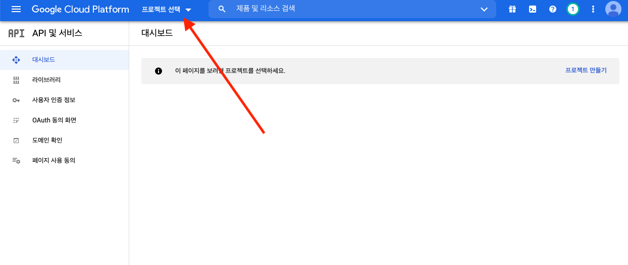 로그인 후 구글 클라우드 플랫폼 페이지 내 왼쪽 위 [프로젝트 선택] 드롭 다운 클릭