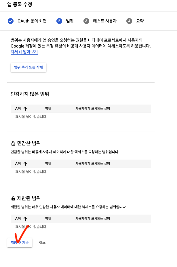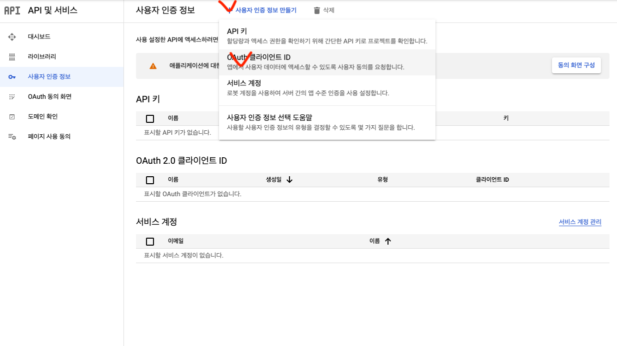 프로젝트 만들기 완료 후 OAuth 동의 화면 클릭 + 아무것도 선택하지 말고 만들기 클릭