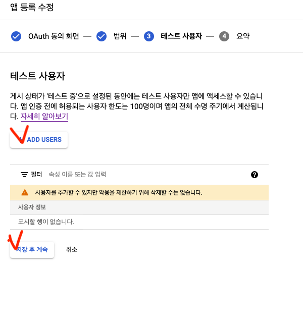 테스트 사용자 등록 후 저장 후 계속 클릭
