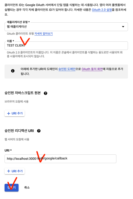 클라이언트 ID 만들기 (체크 표시 된 곳 입력 후 만들기 클릭)