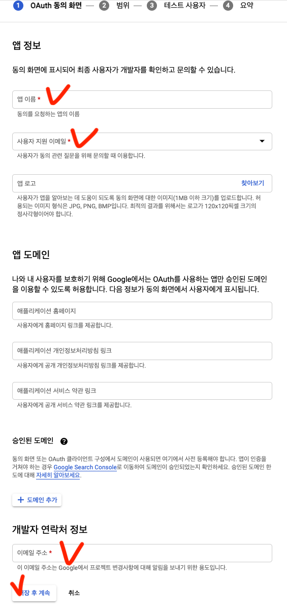 앱 정보 입력 [체크 표시 된 곳 필수 입력]