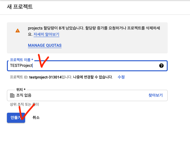 프로젝트 이름 입력 후 만들기 클릭