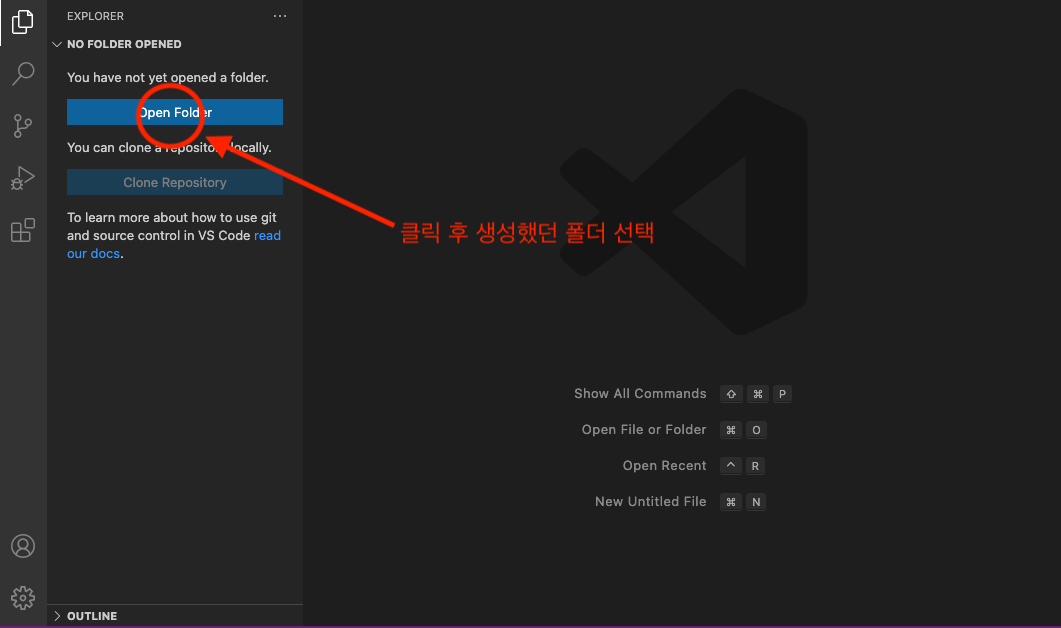 설치한 VSCode를 실행하여 해당 폴더를 선택한다